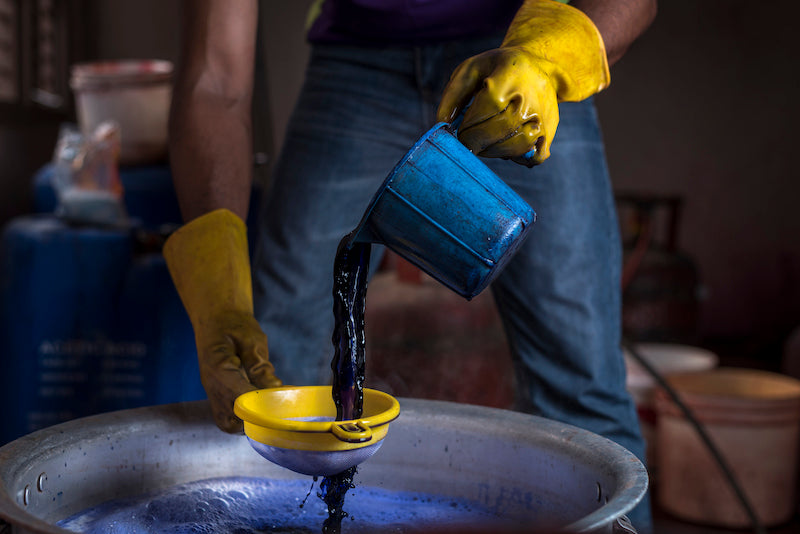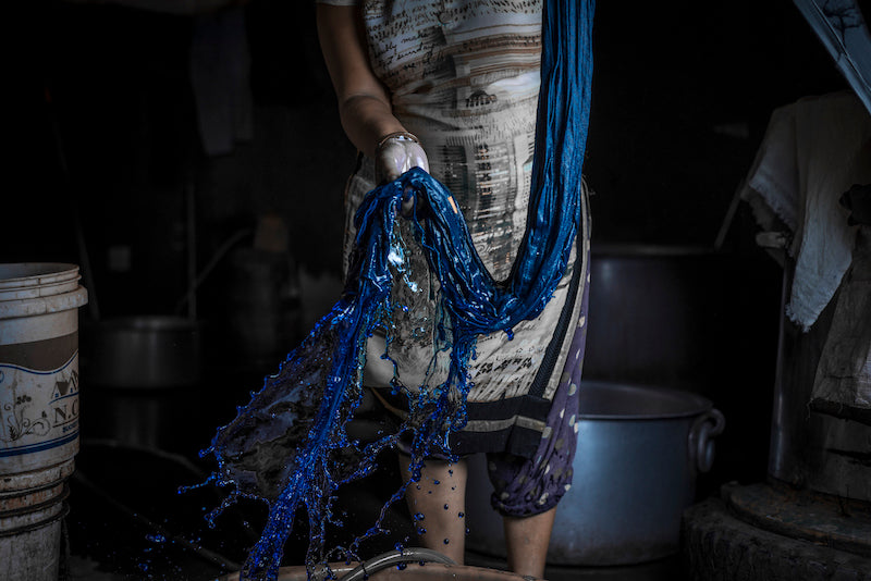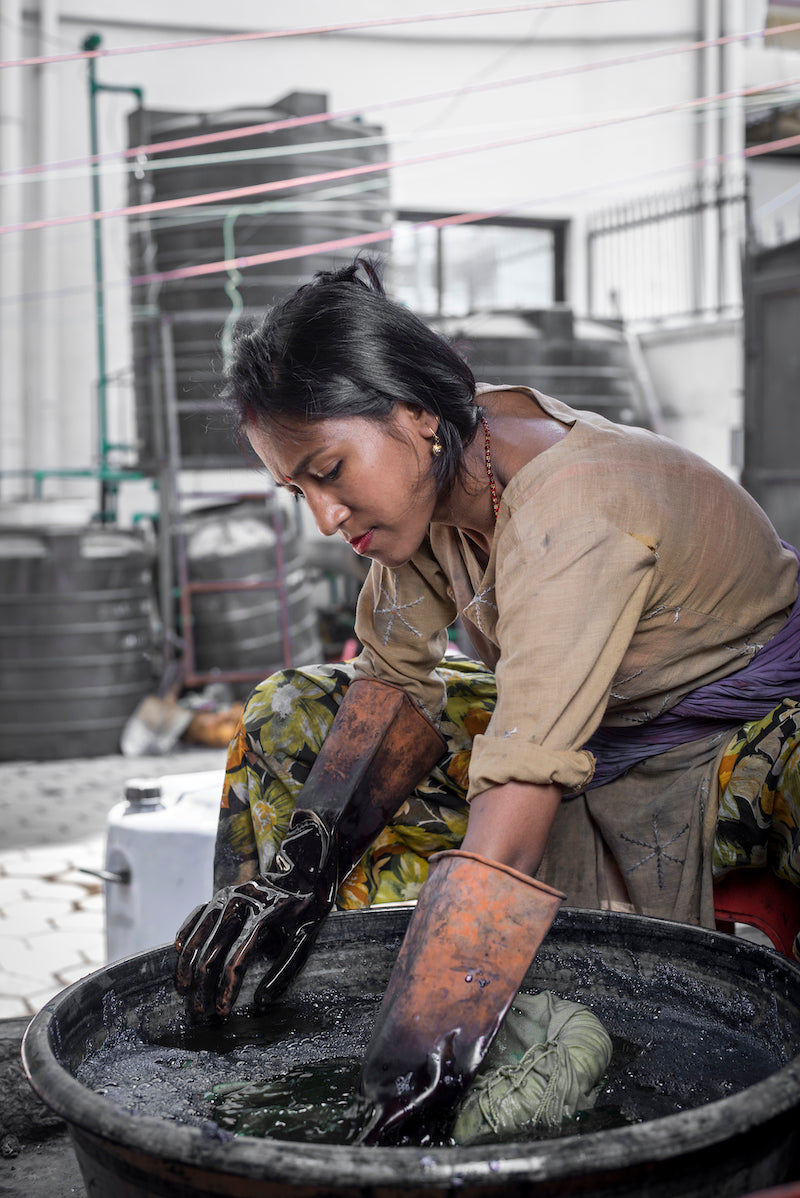 Vi använder endast miljövänliga färgämnen för våra produkter som är säkra för både hantverkare och moder jord. Vi förbjuder alla giftiga ämnen som blekmedel, cancerframkallande ämnen och mjukgörare. Alla våra produkter är färgade i ett slutet vattenslingsystem för att säkerställa att inget läcker ut i naturen. Inget går till spillo - färgämnesrester används som jordgödsel.